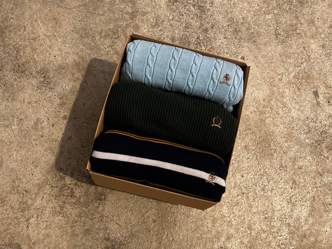 A selection of Tommy Hilfiger sweaters. The sweaters may be unicolor or striped. This bundle comes in different colors, styles and sizes.